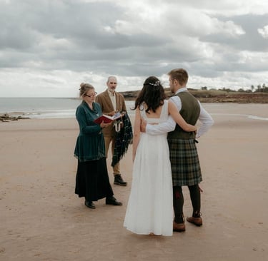 Nur das Paar, ihre Kinder, zwei Mütter und zwei Hunde – eine sonnige, herzliche und unvergessliche Strandhochzeit in Schottland, voller Liebe und familiärer Nähe..