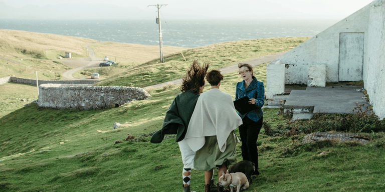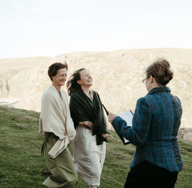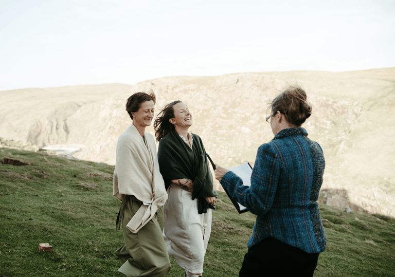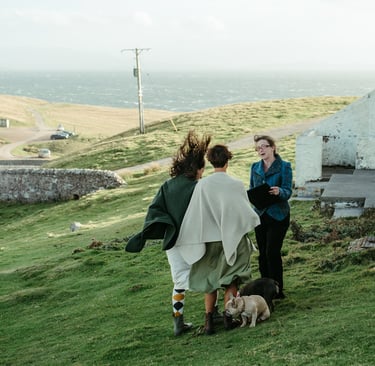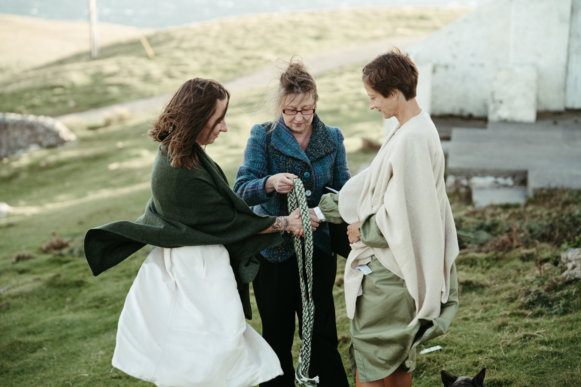 Mit dem Wind als Trauzeugen verbanden sie ihre Hände in einem traditionellen Handfasting. Es war beeindruckend, wie klar und fest sie ihre persönlichen, herzlichen Gelübde gegen die Elemente sprachen, ein Zeugnis ihrer tiefen Verbindung. Wir mussten die Zeremonie in einem zügigen, aber dennoch angenehmen Tempo abhalten, und ich war tief beeindruckt, wie alle dem wilden Wetter mit so viel Gelassenheit und gutem Humor begegneten.