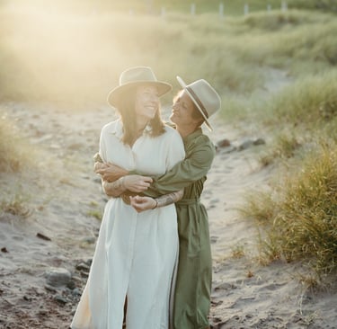 Nach der Zeremonie trafen sie die kluge Entscheidung, nicht an diesem exponierten Ort zu verweilen. Zusammen mit ihrer Fotografin Karo, die wunderbar flexibel war, fanden sie etwas weiter die Küste hinauf einen geschützteren Ort für weitere Fotos – eine letzte kluge Anpassung an einem Tag, der viele erforderte.