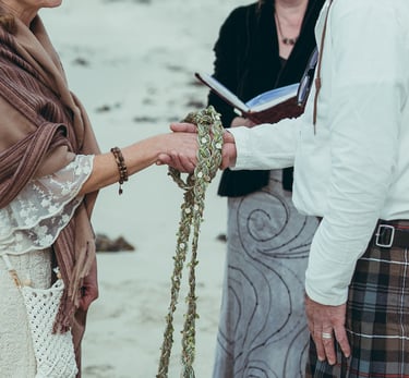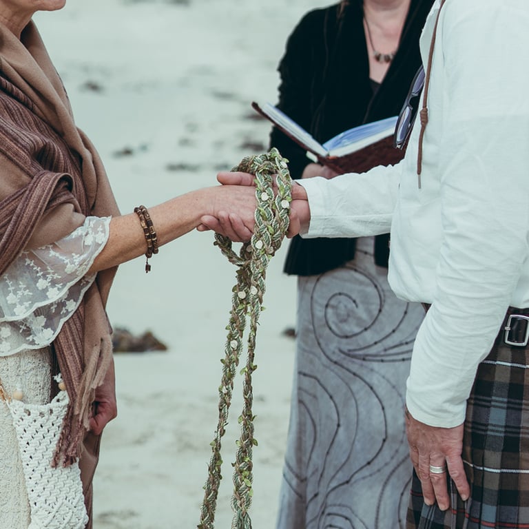 Die Zeremonie im Sand war dann genauso herzlich und unkompliziert. Das Herzstück war das Handfasting, ein schönes Symbol für ihre bereits bestehende, tiefe Verbindung. Ein Gedicht über die Liebe als aufregende Reise passte perfekt zu den beiden. Und zum Abschluss teilten sie einen Schluck aus dem Quaich, den sie mit ihrem eigenen Met gefüllt hatten – eine tolle persönliche Note.