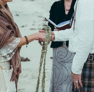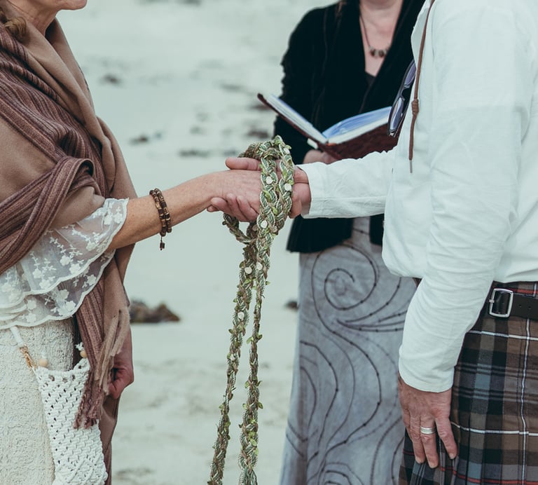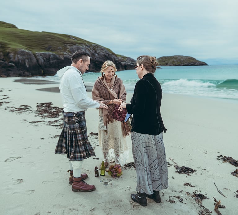 The ceremony that unfolded on the sand was a perfect reflection of their journey. We opened a sacred space by calling on the elements of the four directions, a Celtic tradition that feels so right in the wildness of the Highlands. We shared a line from a poem that felt written for them: "Die Liebe ist eine Reise, die durch ein ziemlich aufregendes aber auch unbekanntes Terrain führt." (Love is a journey that leads through quite exciting but also unknown terrain).