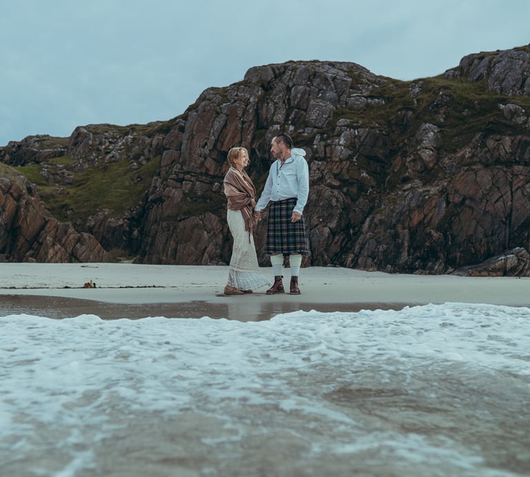 Tanja and Ralph’s journey to their wedding day is a wonderful example of a path that many couples from abroad choose. After getting legally married in Germany, they travelled to Achmelvich Beach for a symbolic handfasting ceremony, bringing two close family members along to share in their Scottish holiday and witness their celebration. This approach is a beautiful solution, allowing couples to enjoy a big party at home while having a more intimate, personal moment in Scotland without the pressure of extra administration.