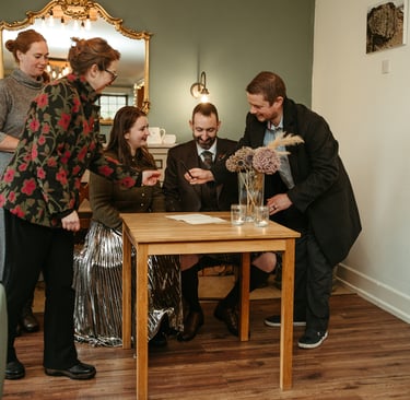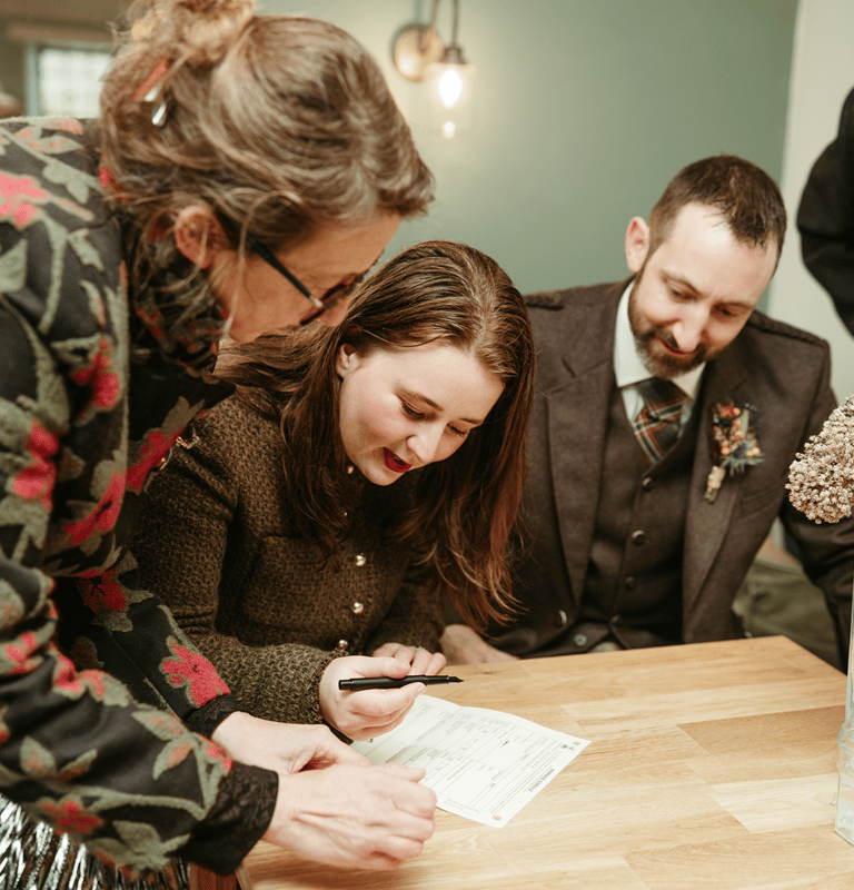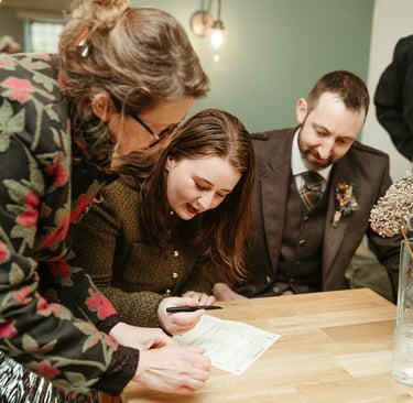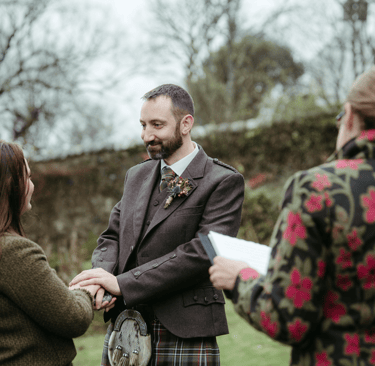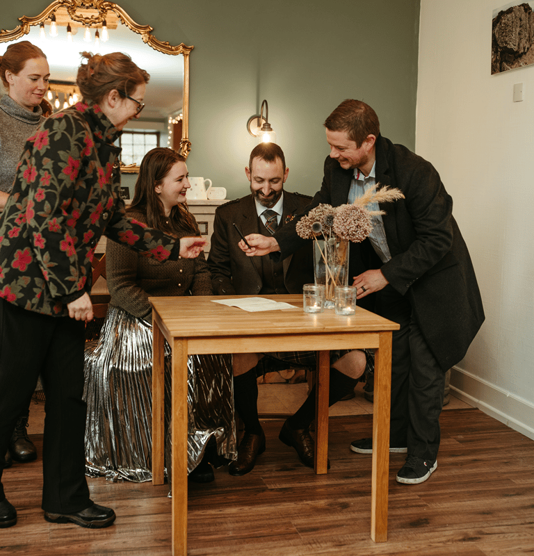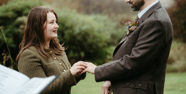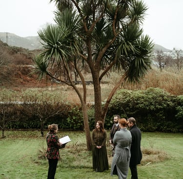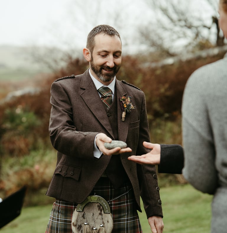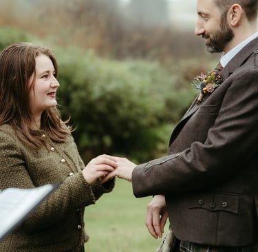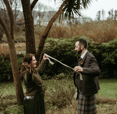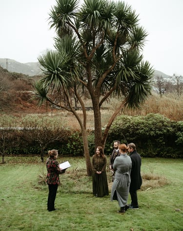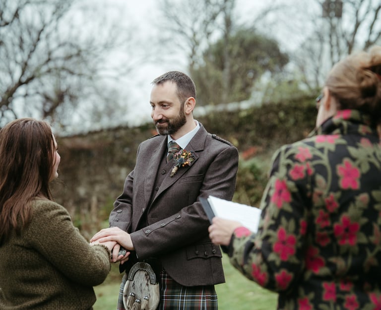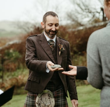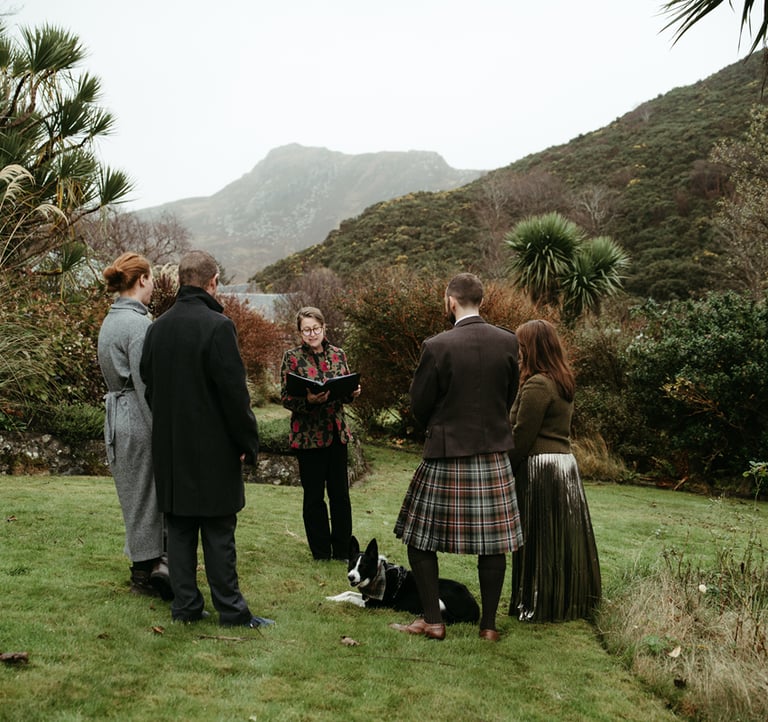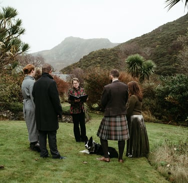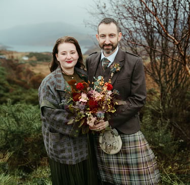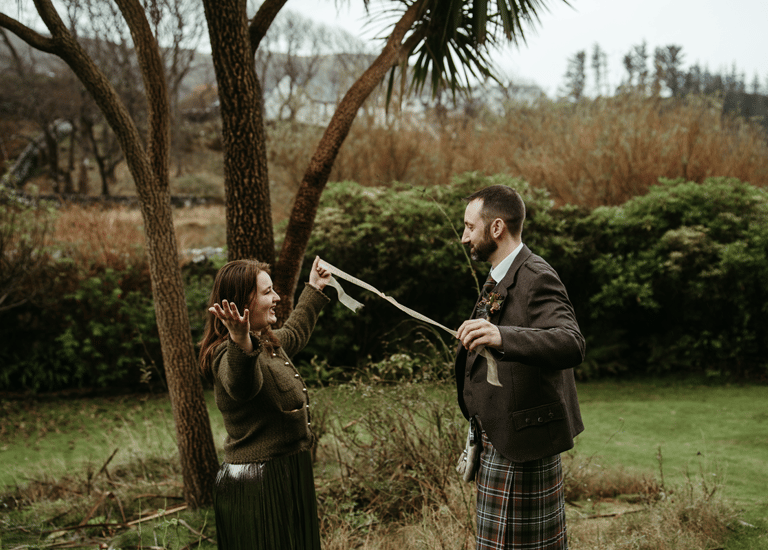 The ceremony that unfolded in this sheltered garden was a perfect reflection of their relationship. We began with a Mary Oliver poem about a love that feels less like a choice and more like destiny, beautifully capturing the spirit of their own story. Their connection is a lovely balance of personalities: Eilidh’s curiosity and thoughtful energy gently complemented by Tommy’s patience and quiet steadiness that holds everything together. Against this backdrop of friendship and calm, they made their promises, their hands bound in a heartfelt handfasting ritual and speaking their vows while holding an oathing stone. After signing the Marriage Schedule in the beautiful Scourie Lodge, where Sophie and Stuart had prepared a lovely, warm setting for this occasion, Eilidh & Tommy explored the area with Karo their photographer. They managed to have some photos taken in the original spot they had chosen for the ceremony - somehow, they got