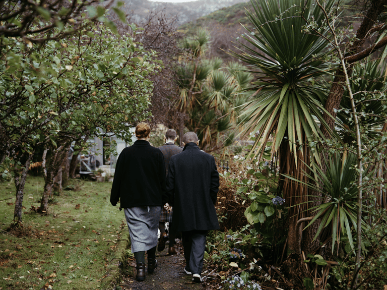 Their original plan was to marry at a favourite outdoor spot from those early days. But on the morning of their wedding, it was clear the weather had other ideas. It had been windy and raining all morning, making an outdoor ceremony impossible. It’s always a heart-wrenching decision to abandon a plan that holds so much meaning, but thankfully, they had a wonderful Plan B. We moved the ceremony to the walled garden at Scourie Lodge, a place that held its own special meaning as it’s run by their dear friends, Sophie and Stuart, who were also their witnesses. And with this change of location came a delightful surprise: a palm tree! It was my first ever Scottish palm tree wedding, a quirky and wonderful twist to the day.