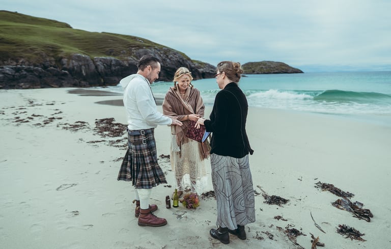Mark & Mairi-Anne celebrated their beach ceremony at Achmelvich, a place dear to Mairi-Anne's heart. The day was filled with personal touches, including heartfelt readings, a handfasting ritual using the Macleod tartan, and a unique quaich ritual with Jägermeister. The ceremony beautifully recounted their journey from "just friends" to a deeply connected couple, creating lasting memories for all involved.