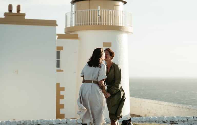 To celebrate their 10th anniversary, Franziska and Anika travelled from Germany to the Stoer peninsula. When a fierce gale made their original plans impossible, they embraced the wild weather with incredible spirit, sharing their vows in a sheltered spot with the wind as their dramatic witness.