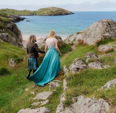 Larissa & Basti feierten ihre deutschsprachige Zeremonie am Achmelvich Beach in Schottland. Sie begannen hoch über der Bucht und endeten unten am Strand – mit vielen persönlichen Momenten, liebevollen Ritualen und einem bewegenden Abschluss am Meer. Ein Tag voller Freude, Nähe und kleiner Details, die ihn unvergesslich machten.