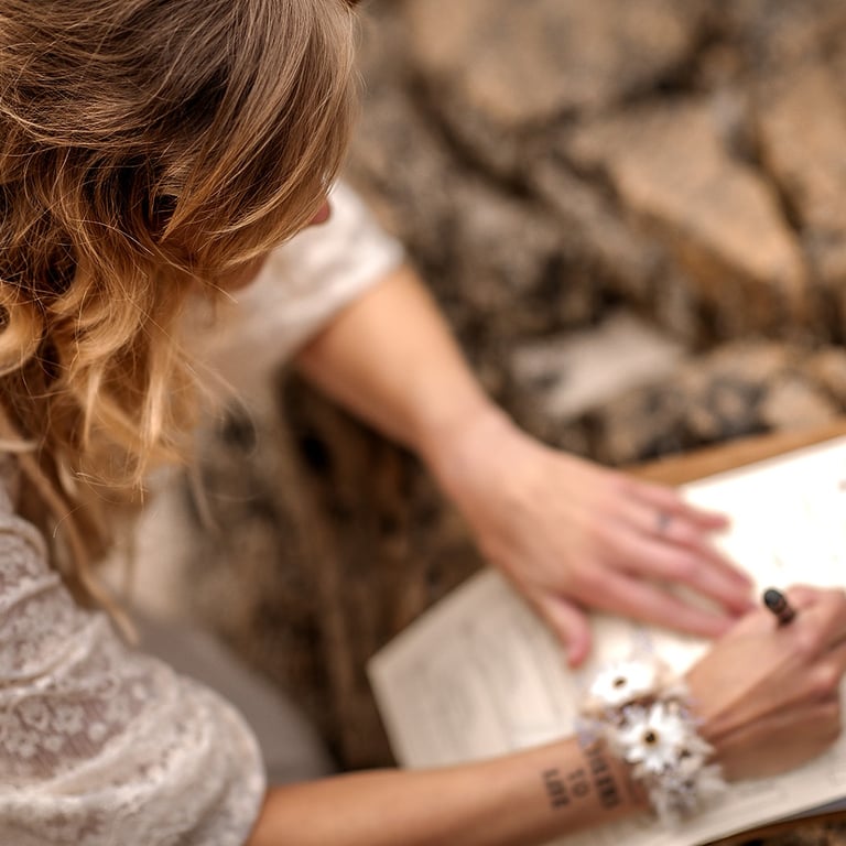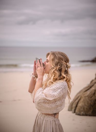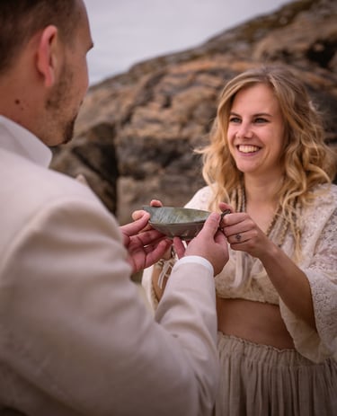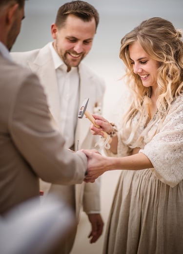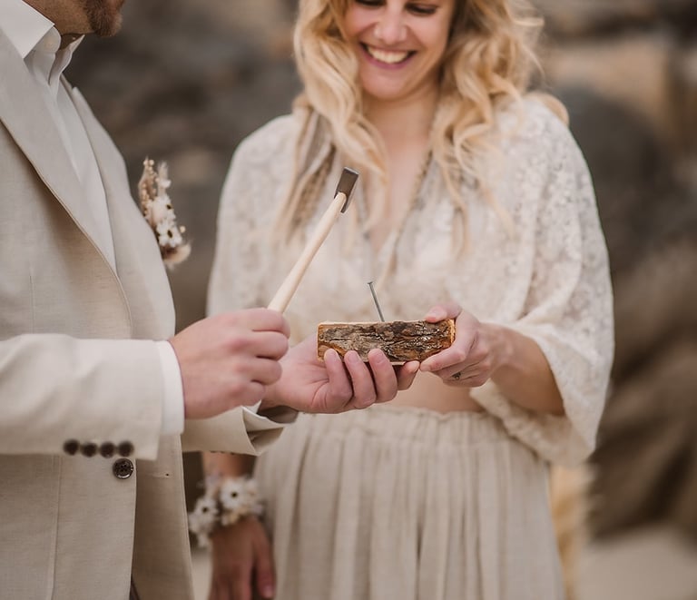 Nach dem Handfasting folgte ein sehr persönliches Ritual, das an den Anfang ihrer Geschichte anknüpfte. Mit einem Hammer, den sie aus der Heimat mitgebracht hatten, schlugen sie gemeinsam einen Nagel in ein Stück Holz. Auch ihr Eheversprechen passte perfekt zu ihnen: ein klares und starkes „Ja, ich will“ auf die Fragen zu ihrer gemeinsamen Zukunft.
