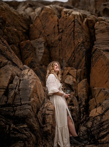 Das Wetter am Hochzeitstag war zum Glück trocken und freundlich. Zwar hatte ich auf den typisch blauen Himmel gehofft, der das Meer hier türkis färbt, aber die sanften, gedämpften Farben des Tages hatten ihre eigene Schönheit, die ihr Freund als Fotograf toll eingefangen hat. Die Stimmung war unglaublich entspannt und fröhlich. Wir sind dann alle ganz gemütlich zum kleinen Strand von Achmelvich spaziert. Und durch meine Intuition passte mein Outfit farblich sogar perfekt zur Hochzeitsgesellschaft.